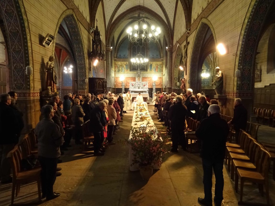 Après un dimanche des Rameaux très suivi notre secteur paroissial s’est retrouvé à Luzech pour la célébration du Jeudi Saint. Autour d’une grande table magnifiquement décorée, nous avons commémoré ce dernier repas de Jésus avec ses apôtres, repas qui nous rassemble depuis, ainsi, à chaque Eucharistie. Deux gestes symboliques ont marqué cette cérémonie. Le lavement des pieds par le Père Shane, geste d’humilité et de service accompli dans la simplicité et la communion sous les deux espèces.